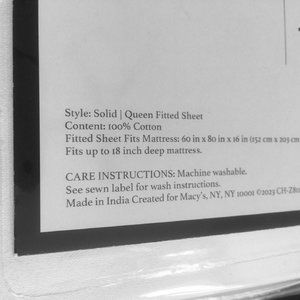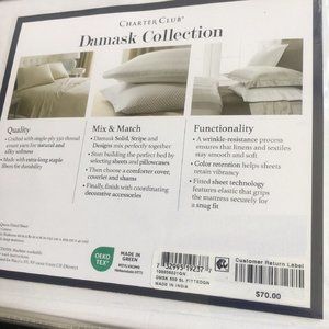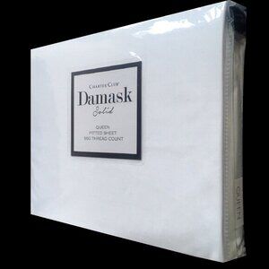 brand new Charter Club Damask 550 Thread Count 100% Cotton Queen Fitted Sheet. The color is White ... and the sheet is solid color / no pattern / unpatterned. The label on the package states: "Queen Fitted Sheet is 60 inches x 80 inches and fits mattresses up to 18 inches deep. Any presence of fabric softener can cause erosion to sheet fibers." Condition is brand new, factory-folded in unopened, undamaged, original retail packaging ... UPC 732995192377.