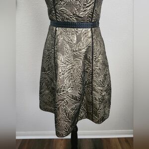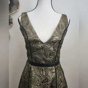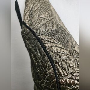 Gold jacquard (100% Polyester). Sleeveless. V-neckline. Hourglass. Exposed back zipper. Fully lined. Boned bodice. Made in USA. Great pre-owned condition, no flaws.