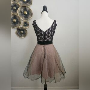 Sleeveless. V neckline. Full skirt. Hidden back zipper with hook-and-eye closure. Fully lined.