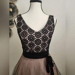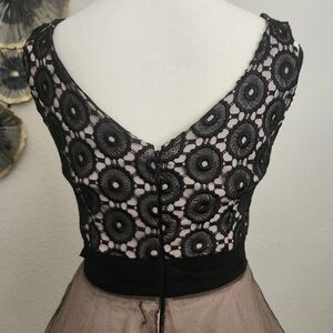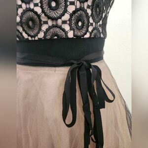 When I got this dress, I thought the skirt was the way it was and I didn't realize how it was suppose to look until I found a stock photo. It looks to have been altered in some way, there is no pleating and there is one hole in the black tulle on the side. There are a total of 3 layers, 1 of tulle and 2 layers of lining. Still a beautiful dress nonetheless.