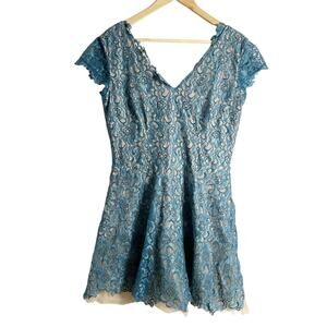 nha khanh On Cloud Nine Teal Blue Lace Tulle Cap Sleeve V-Neck Mini Dress Sz 10