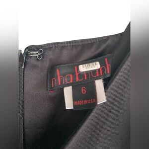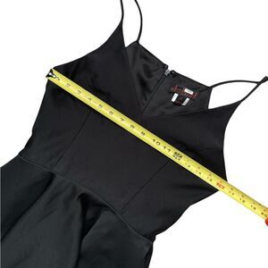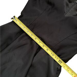 Black crepe (100% Polyester). Sleeveless. V-neckline. Full skirt. Hidden back zipper with hook and eye closure. Fully lined.