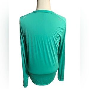Size medium teal/green women’s Nike Dry Fit top large swish on the front and reflective rectangles on back shoulders