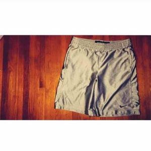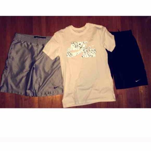 two pairs of nike basketball shorts, both size small, one black with white swoosh, and one silver with black swoosh. the shirt is a small, white with a really cool reflection.🏀