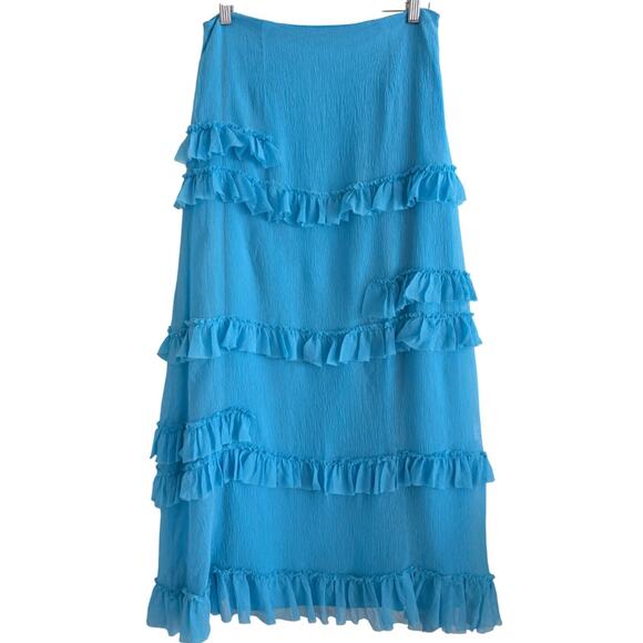 blue silk chiffon, ruffle trim, maxi length, fully lined, side zip closure