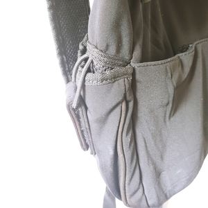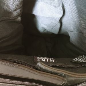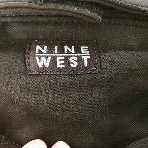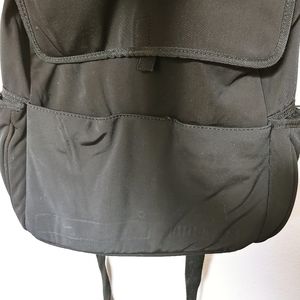 Black Nine West backpack. Nylon material. Has lots of storage pockets. 1 zipper pocket on the back. Two Side Pockets. One front pocket. One interior pocket. Velcro closure. Washable. Adjustable straps.