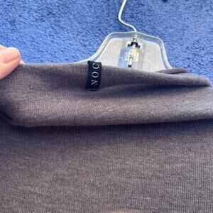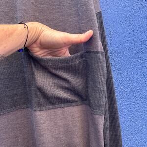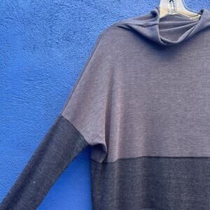 stunning, minimalist, and comfy / no fabric tags, but feels like a very light wool blend with ribbed jersey accents / one size styling, best fitting medium-extra large / long sleeves to scrunch up with thumbholes / super sleek and original / darker taupe with dark gray accents / excellent preowned condition