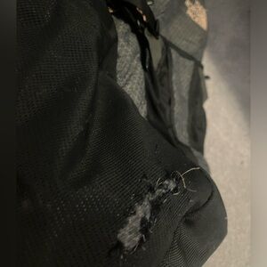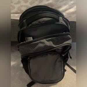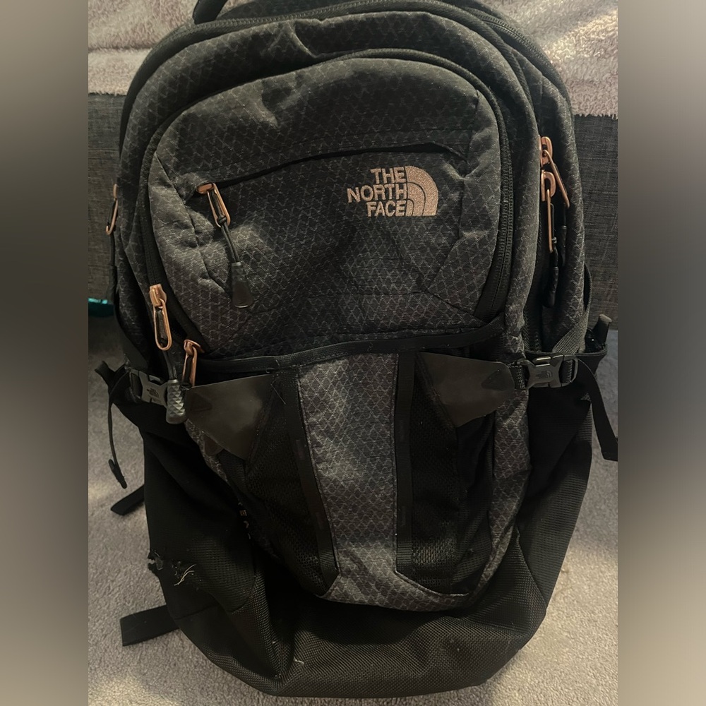 northface greyish/black with rose gold detailing recon backpack. small holes in the water bottle holders but otherwise great condition