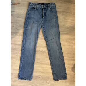Classic NYDJ (Not Your Daughter’s Jeans) straight-leg jeans in a timeless medium wash. Made in the USA from 99% cotton and 1% spandex, offering the perfect balance of comfort and structure. Features five-pocket styling, zip fly with button closure, and signature lift-tuck technology for a flattering fit. Tag size 6 (fits like a 6/28). Approximate measurements: 13.75” waist, 32.75” inseam, 43.5” length.