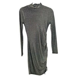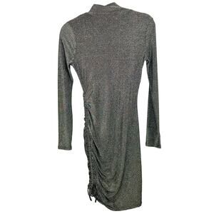 n:philanthropy Gold Black Metallic Demetra Mock Neck Asymmetric Mini Dress with drawstring hem. Has a lot of stretch.