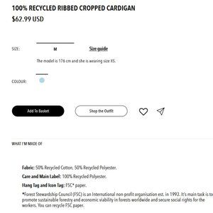 The cardigan is made from 50% recycled cotton and 50% recycled polyester.