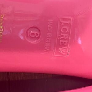 these are new without tags/new without box and have never been worn. j crew Mercantile . There are some smudges on them from storage and moving. They are a beautiful pink color style number 36016. They have a nice breathable perforation on the inside of the foot. A great alternative to rain boots or wellies in the summer.