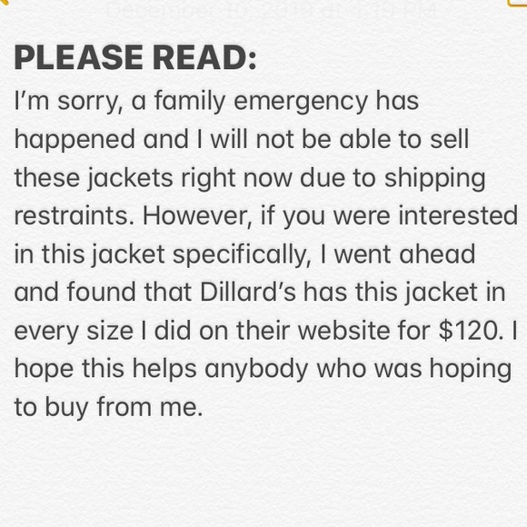 @kthom3 @erinvie I am so so sorry but I have to cancel your orders. A really sudden family emergency just happened and I won’t be home for a few weeks so I won’t be able to ship them. I will cancel immediately. I checked real quick and it looks like Dillard’s has the same sizes and colors at the same price we had agreed on. Again I am so so sorry to have to do this.