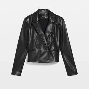 This faux leather jacket will be the coolest piece in your wardrobe. Double breasted for a sharp look and cropped for extra flair, it features front pockets and uniquely crested buttons on the front and cuffs. Wear it year-round as an added layer or final layer for a model-off-duty moment.