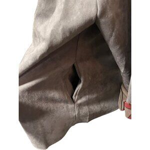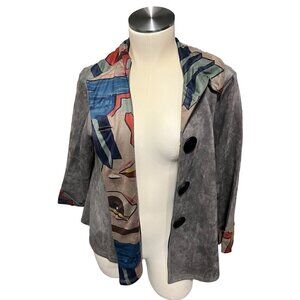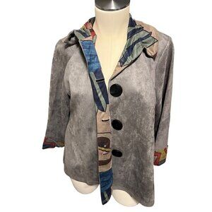This large Radzoli NWT Faux Suede Retro Button-up Closure 3/4 Sleeve in grey multicolored closure is a stylish, retro-inspired piece perfect for any wardrobe. Its soft faux suede material ensures comfort and durability.