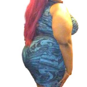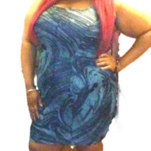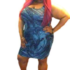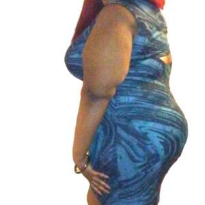Brand new, never worn with all original tags, still attached beautiful plus print dress with cut-out detail on mid back great stretch. The color is a greenish grey and black