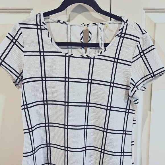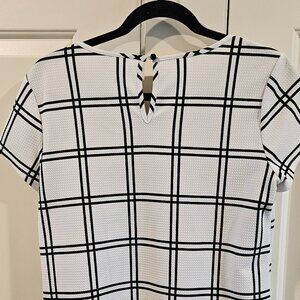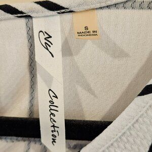 ny collection women's short sleeve top. SZ S. Black/white print. PTP: 19 in. L: 25 in. Great piece for the office.