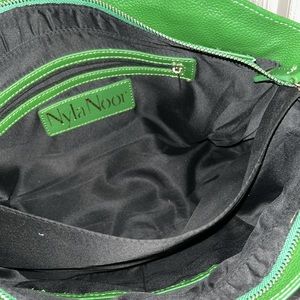 large bag with dual shoulder straps - they drop about 10” - in great condition- this bag feels and appears to be genuine leather, but Nyla Noor is known for her use of vegan leather… bright vibrant kelly green - perfect spring & summer bag - top zipper closure opens up to 2 large lined sections - one with a wall zipper pocket & the other wot 2 wall slip pockets- cones complete with original matching tassel - great condition- like new - no dust cover