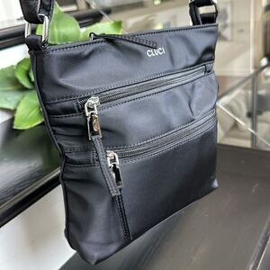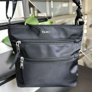This like new ((may have never been used) CLUCI handbag is versatile and easy to grab and go no matter the season. The black vinyl bag is easy to wipe clean and has two zipper pockets on the front for easy organization. There is a zipper pocket on the back of this brand new bag too. That is perfect for your cell phone or keys. The adjustable shoulder strap is easy to carry and can be doubled as photograph giving it an approximate 12 inch drop or can be adjusted to have an approximate 24 inch drop. The top of the bag has a strong and secure zipper and opens to brand newmedium brown colored fabric inside with a zipper pocket and large open pocket for organizing. This bag is easy to carry and perfect for travel would make a great gift