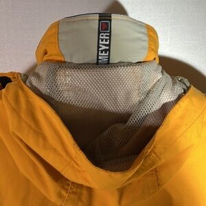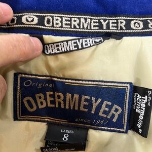 Obermeyer Glacier women’s ski jacket size 8, yellow gold/tan/blue, drawstring waist, Velcro wrist closure, zipper front pockets and 2 zipper waist side pockets, good condition