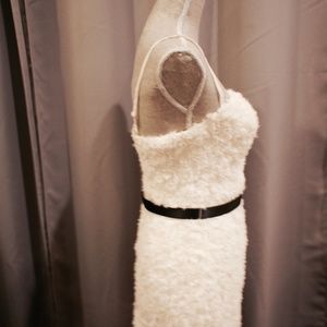 Adorable off white mini dress comes with black removable skinny belt. Embellished polyester material with 5% spandex, so dress does not have a lot of give. Worn Once. Perfect for all occasions.