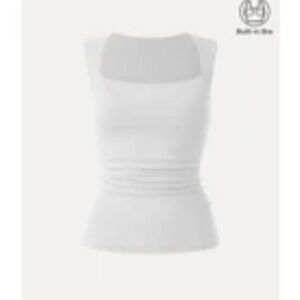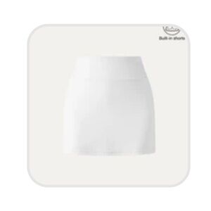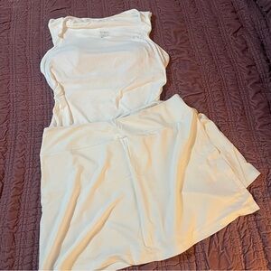 white mini skirt with built in shorts and side slit and square neck brami tank with ruched sides