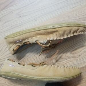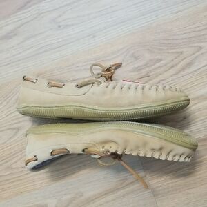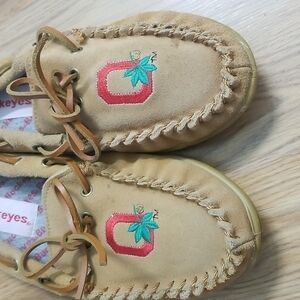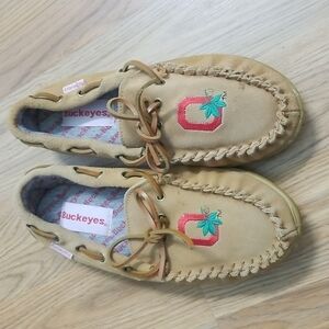 Ohio State Leather Moccasin Boat Shoes. These hard soled shoes in a tan leather with outside laced and tie. Cushioned insole. O and Buckeye Leaf logo stitched on. Size Womens 7/8. GUC.