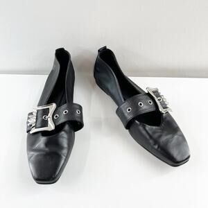 leather, square snip toe, mary jane, flats, ballet, slip on, angel wing silver buckle detail