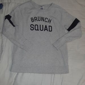 Old Navy Cozy brunch squad lightweight sweatshirt size Small. It seems like an oversized small to me. It is not tiny. I can take measurements if you need. The sweatshirt body is a soft grey color and the writing and sleeve bands are a faded black.