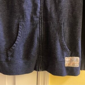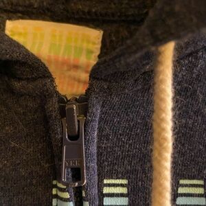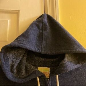 Soft and comfy jacket in good used condition. No stains or defects. It does show light, normal Signs of wear but has plenty of life left. Nice Sweatshirt material to keep you warm but not too heavy. Nice hood with a drawstring and front pockets for your hands. My daughter loved it.