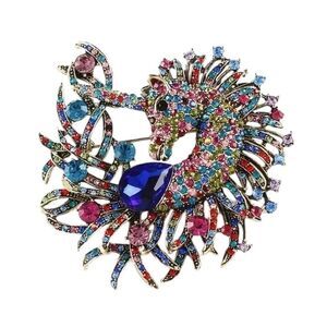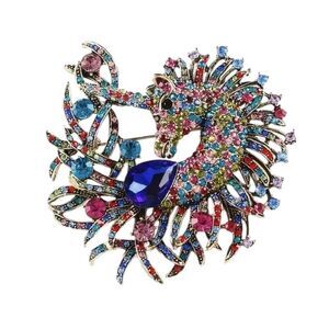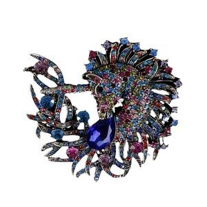 This vintage brooch features a large horse unicorn equestrian design with fringe detail, adorned with multicolor simulated crystals. The 2-inch pin is made of alloy with a prong setting and pave crystal centerpiece. It has a retro equestrian theme with a touch of old money glam, perfect for dressing up all your wears even a hand bag or t shirt, very sparkly