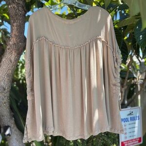 Elevate your wardrobe with this stylish oversized tan button-down blouse. Perfect for any occasion, this top offers both comfort and elegance.