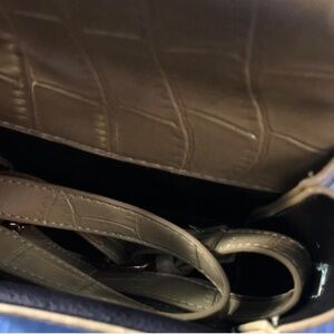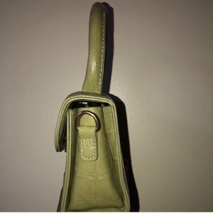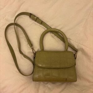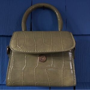 olive green handbag — crocodile pattern. Can be held with handle or with crossbody attachment inside