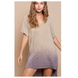 Our "FELT SOFT" knit top featuring Our "FELT SOFT" knit top featuring ombre hand dip die color way, raglan short sleeve with raw seam line detail, clean low V neckline, slit on the side with high and low length.