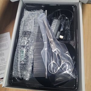 This is new in box. 6 limit combs, trimming scissors, metal comb, cleaning brush, oil for lubricating the blade, charger all included.