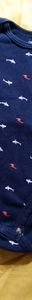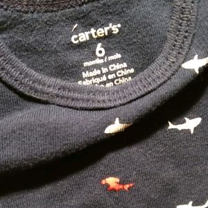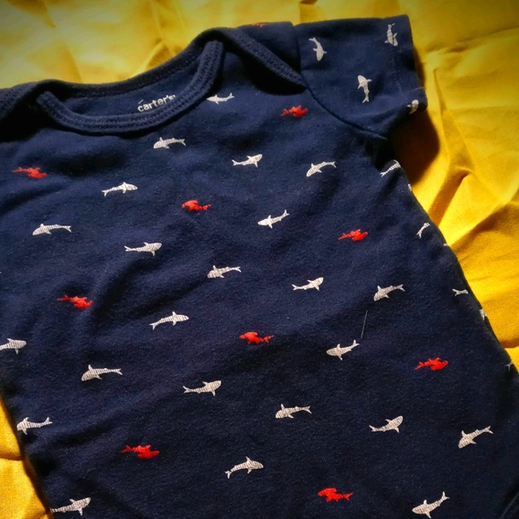 Navy blue, short sleeve onesie, with little red and white sharkies on it.