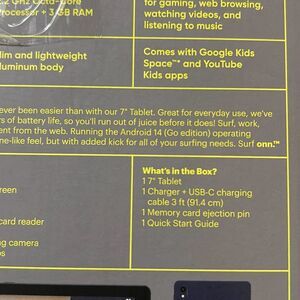 What's in the box? (1) 7" Tablet, (1) Charger + USB-C charging cable 3 ft (91.4 cm), (1) Memory card ejection pin, and (1) Quick Start Guide