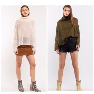 Around The Campfire Cream Turtleneck sweater featuring contrast open weave knitting detail on garment. Designed in relaxed fit with distressed draped turtleneck, distressed edges on sleeve and finished with overlay on back