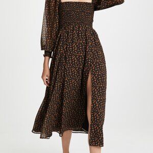 A picture-perfect version of an everyday maxi dress, this silhouette from OPT features soft smocking at the bodice, a classic floral print, and a deep front slit.