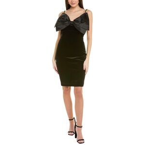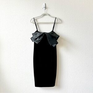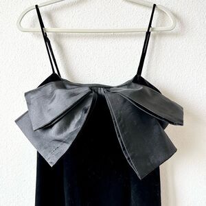 This elegant black dress features a striking bow detail, perfect for a special occasion. Its sleek design offers a sophisticated look.