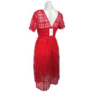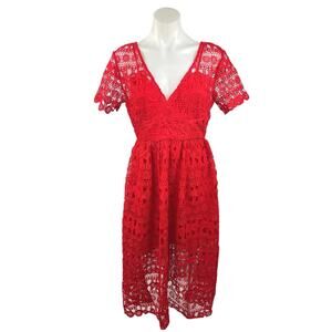 o.p.t Women's Red V-Neck Short Sleeve Back Zipper Lace Fit & Flare Midi Dress S