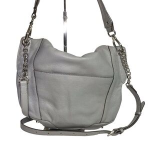 Bag is made of grey leather with silver tone hardware. Features shoulder strap, adjustable crossbody strap with chain detail, four feet on the base, magnetic slip pocket on the back, two zippered front pockets, and magnetic top flap closure. Interior features 2 slip pockets, and 3 zippered pockets. Bag is clean and in good condition. Please see photos for glue mark near the handles on the back of the bag.