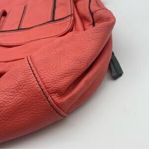 orYANY Leather Large Fold-Over Flap Front KATIE Hobo Shoulder Bag, excellent condition, some marks and scratches on outside (see pics) no major wearing, small thread pull on handle rings, pebbled leather, lots of storage pockets on front, back and inside, please see pics for approximate measurements, beautiful coral color