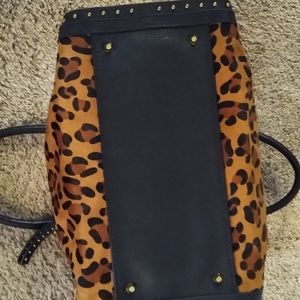 Cheetah hair skin w/black leather trim & studs. Has detachable shoulder strap. Zipper closure. 2 inside pockets and 2 other pockets. Also a dust bag included.