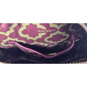 This trendy orYany "canteen" style crossbody bag is a classic evening bag or a day-to-day bag for the essentials. This unique bag has so much personality in its canteen shape, with suede in the front and leather in the back. It features a round, crossbody design with a tassel and an embroidered logo medallion in the center. The Burgundy color is a very popular color for this bag. The long, adjustable strap is well-made and very supple, and the gold-tone hardware is lovely.