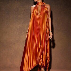 orange elegant Womens Pleated High Low Backless Halter Maxi Dress