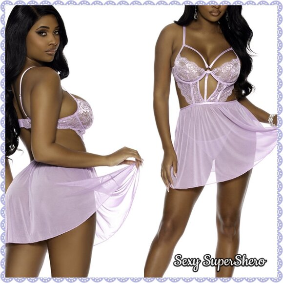 🆕💜orchid Bloom Lace & Mesh Underwire Babydoll Lingerie Set