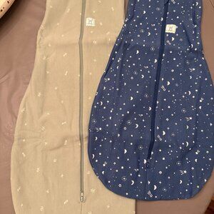 ergoPouch organic cotton baby swaddles bundle. Includes two swaddles, one night sky (blue) and one sage green print (note: the green swaddle is a different print than what is actually pictured on the packaging, it is the sage green print included in the bundle). Blue swaddle is 0-3 months sizing and green swaddle is 3-6 months sizing. Both swaddles are 1.0 TOG (1.0 TOG suited for room temperatures between 70–75°F). Secure, multi-functional swaddle and sleep sack in one. Suitable from birth to rolling. Made from certified organic cotton. Features simple zip design, no wrapping. Skin, hip and shoulder friendly. No need for blankets. Great baby shower gift/gift for new baby! Smoke-free home. Brand new.