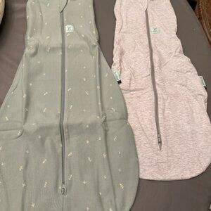 Organic cotton baby swaddles bundle. Includes one green 1.0 TOG (1.0 TOG suited for room temperatures between 70–75°F) 3-6 months sizing and one solid grey swaddle 0.2 TOG (suited for room temperatures between 75°F+) 0-3 months sizing. Secure, multi-functional swaddle and sleep sack in one. Suitable from birth to rolling. Made from certified organic cotton. Features simple zip design, no wrapping. Skin, hip and shoulder friendly. No need for blankets. Smoke-free home. Brand new.