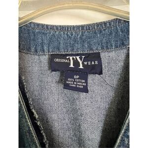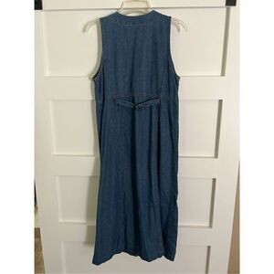 Super cute jean dress with snap buttons. 100% cotton. Excellent condition. Size 8 petite. Dark blue denim Fitted style. Wear alone or with top underneath. Approx measurements across chest 17” waist 18” length 45”